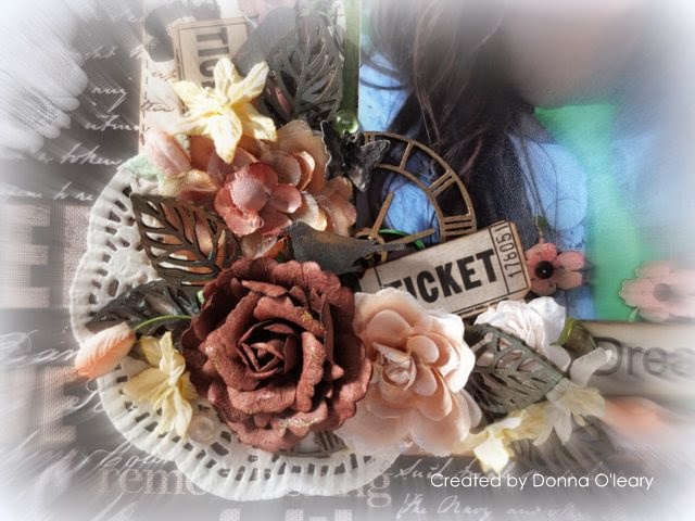 This layout is full of MM goodies, hidden in this photos is a clock, bird and leaves plus a number of MM flowers. I coloured the MM with metallic rub-ons.