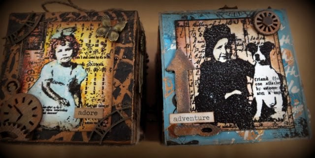 Then the fun began with adding the finishing touches. I added alot of memory maze chipboard to my blocks. I painted them with distress paint, sanded, aged and added ink to get the effect I wanted.